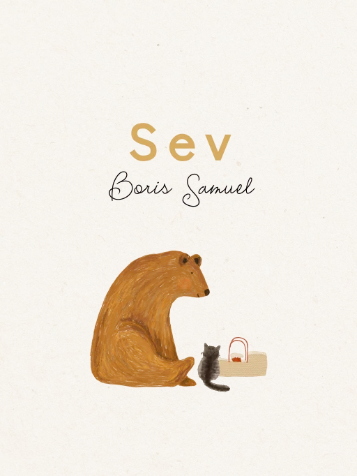 Canvasposter met een lieve grote vriendelijke beer, een kat en een baby in een rotan reiswiegje.