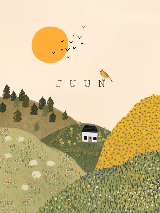 Canvasposter van heuvels, een huisje, de zon en vogels