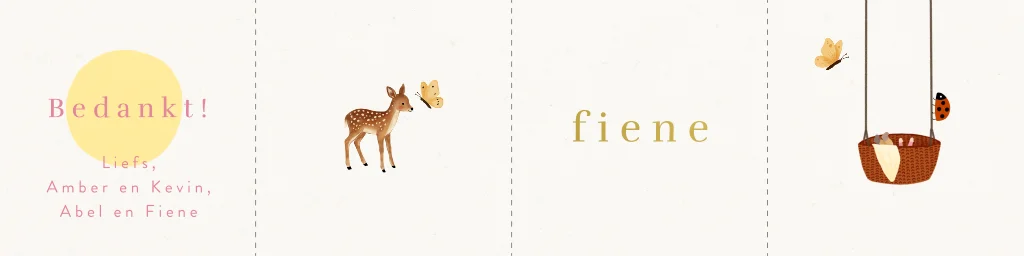 Vierkant doopsuikerdoosje van 50 x 50 mm met een baby in een hangmandje, kleine dieren en een hertje. De naam staat met goudfolie op het doosje.