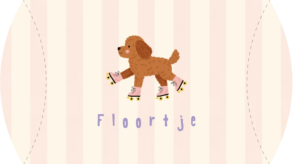 Een doopsuiker gondeldoosje van 110 x 90 mm (gevouwen formaat) met een rolschaatsende bruine labradoodle.