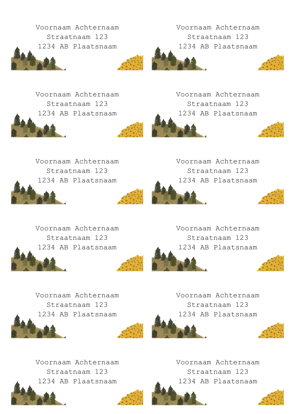 Adresstickers met heuvels met daarop bomen en bloemen.