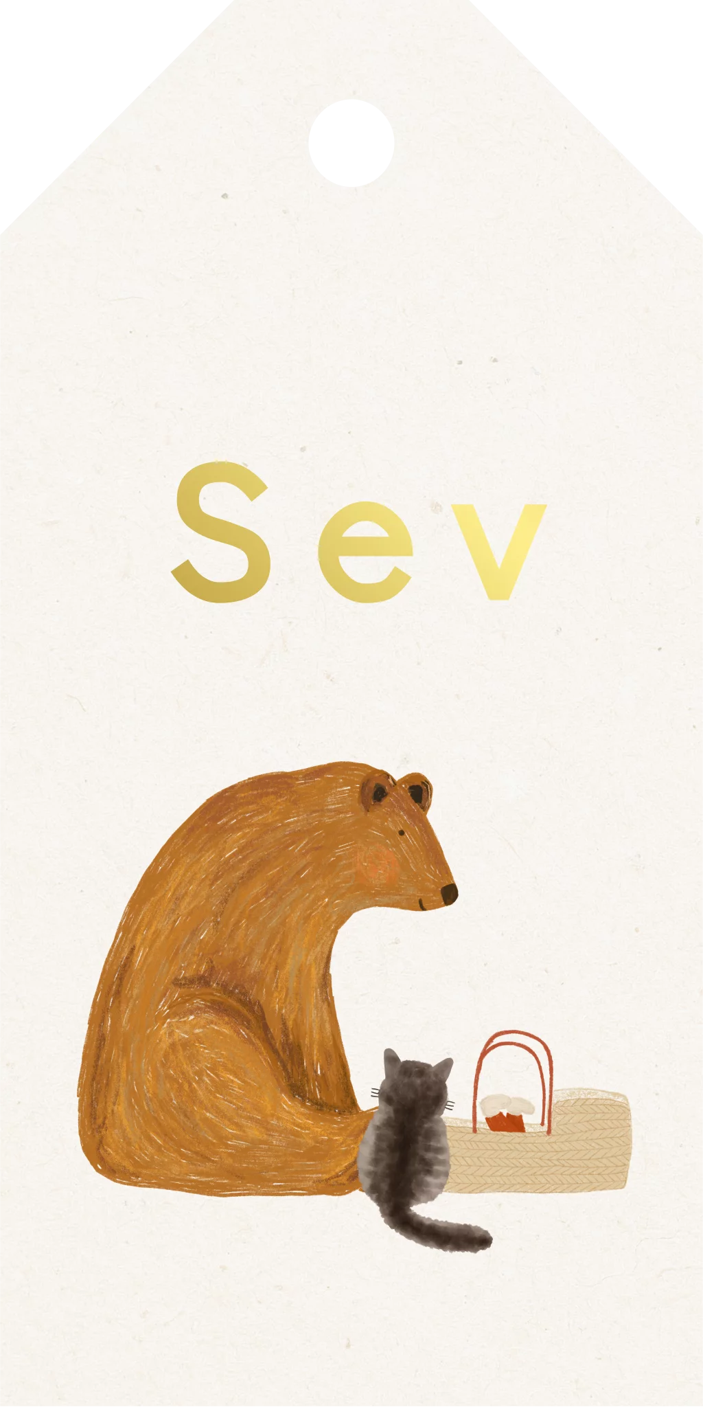 Op het label staat een lieve beer een, kat en een baby in een reismandje. De naam staat in goudfolie maar kun je uiteraard ook aanpassen naar een gewone kleur.