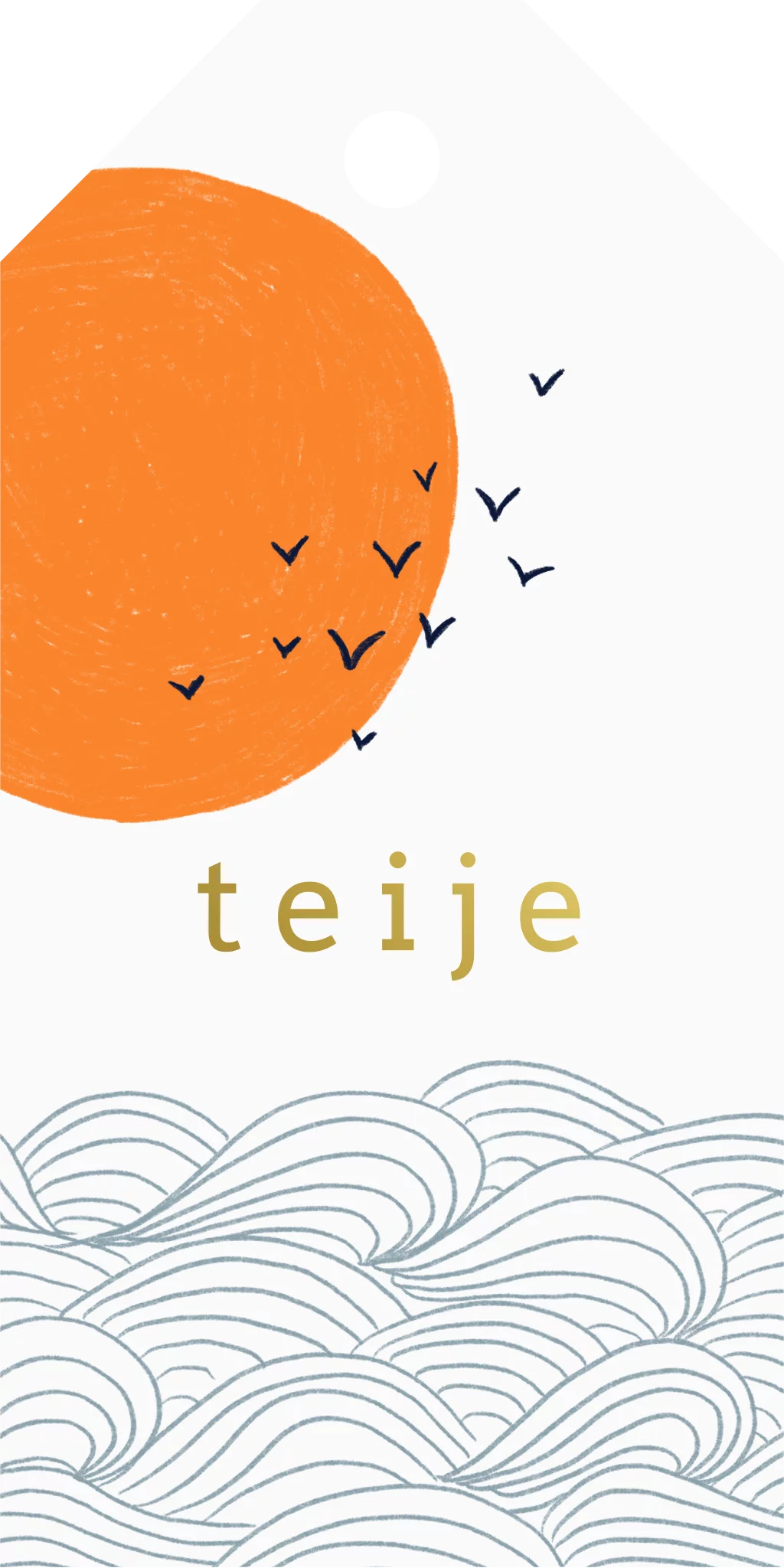 Op het label staan golven van de zee, een grote oranje zon, vogels en de naam staat in goudfolie.