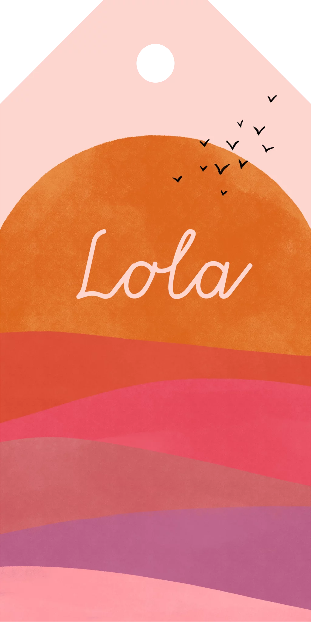 Label met de zee, zon en vogels in roze, oranje en paars