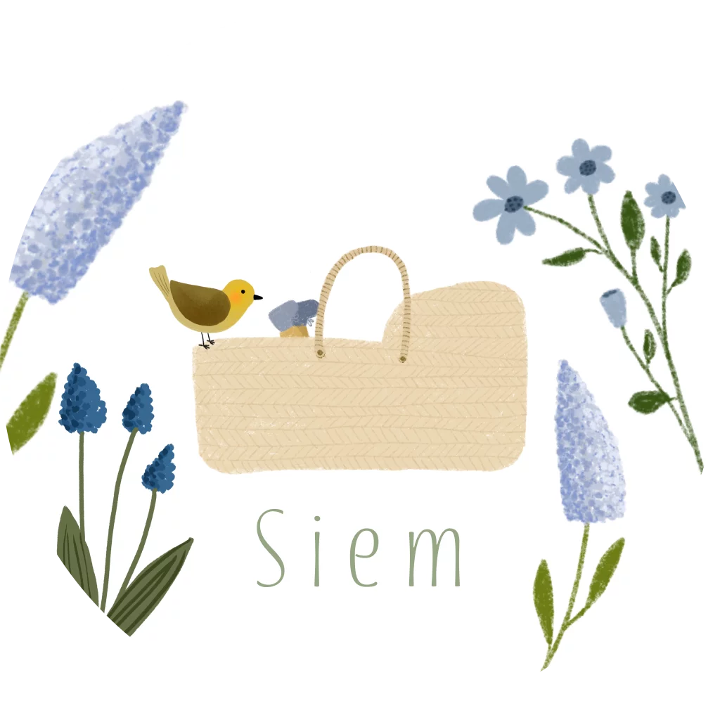Rond label met blauwe bloemen, een kindje in een rotan reismandje, een vogeltje en de naam van je kindje. Super leuk om te gebruiken voor het doopsuiker of een traktatie bijvoorbeeld. Door het gaatje kun je het labeltje gemakkelijk ergens aan vastmaken met een touwtje, koordje of lintje.