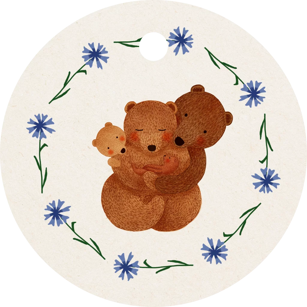 Rond label met blauwe bloemen, een beren-familie