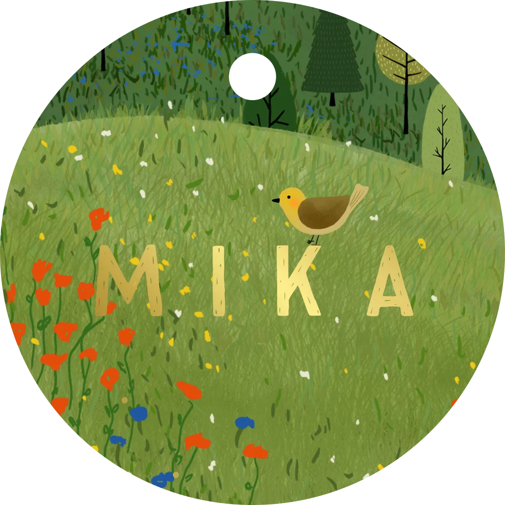 Rond label met heuvels, gras, klaprozen, andere bloemen, een vogeltje en de naam in goudfolie.