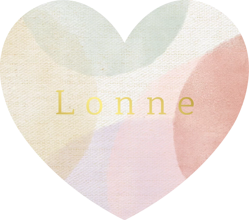 Sticker in hartjes vorm met gekleurde bollen in zachte kleuren. De naam staat in goudfolie.