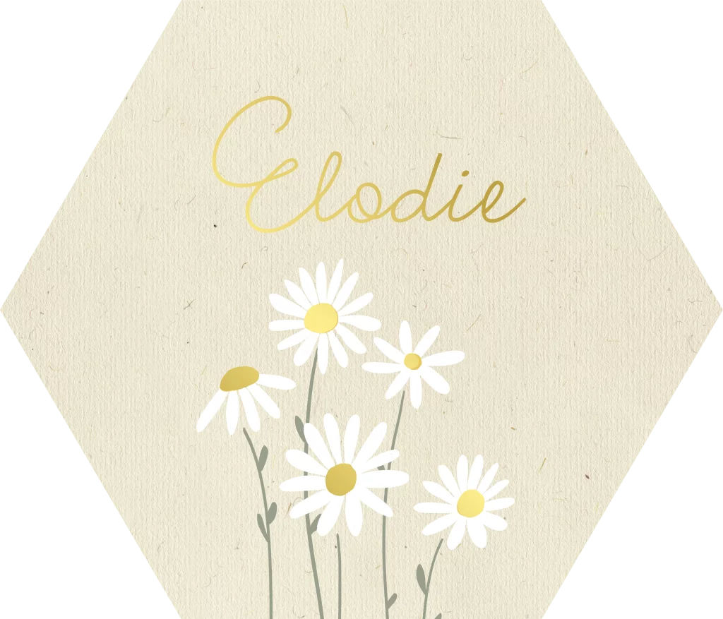 Hexagon sticker met madeliefjes en goudfolie.