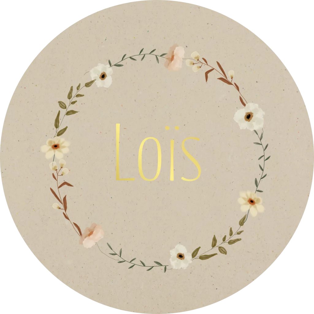 Stickertje met een bloemenkrans en de naam in goudfolie