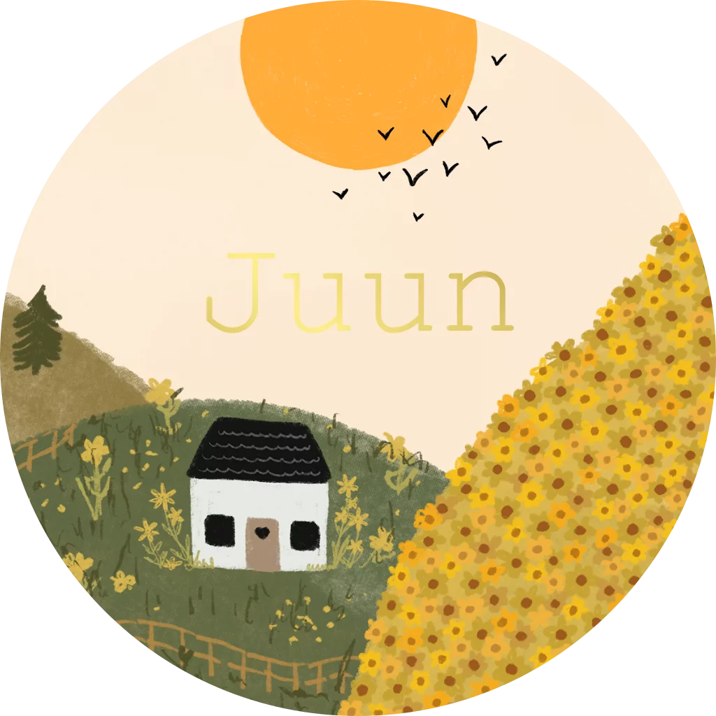 Sluitzegel of sticker voor het doopsuiker met een landschap, huisje, een zon, vogels en de naam in goudfolie.