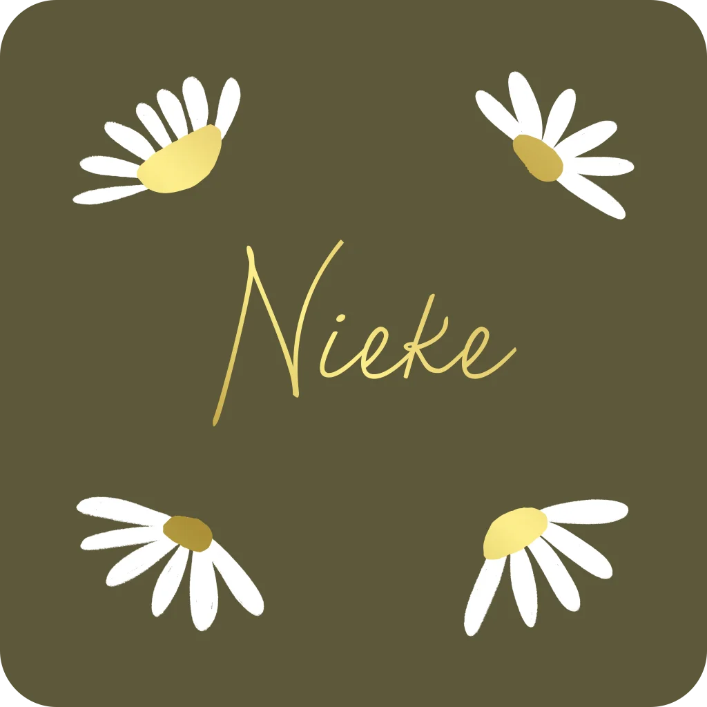 Ben je op zoek naar een leuke en originele sticker voor je doopsuiker? Dan is deze vierkante sticker met donkergroene achtergrond, madeliefjes met folie harten en de naam van je kindje ook in foliedruk perfect!