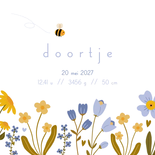 Geboortetegeltje met bloemen en een bijtje in blauw-gele kleuren