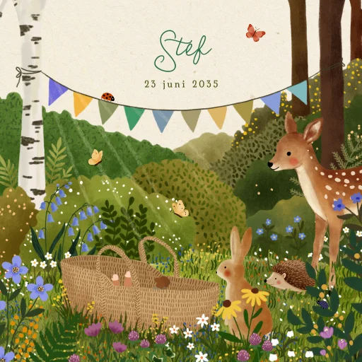 Geboortetegeltje met een bos, slingers, dieren en een baby'tje