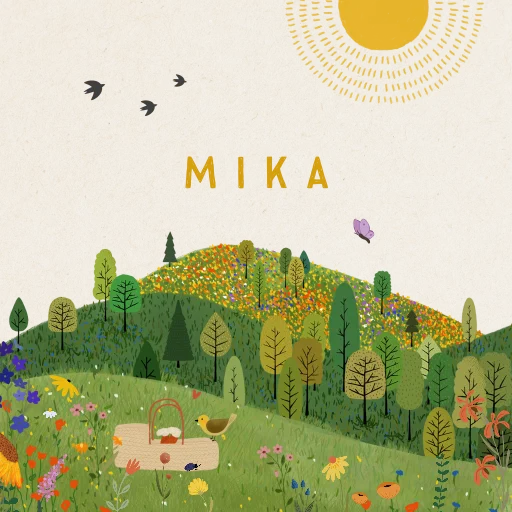Geboortetegeltje met heuvels, vogels, de zon en een baby'tje in een reiswiegje.