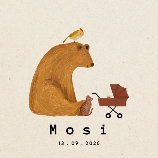 Tegeltje met een grote beer, kat, vogel en een kindje