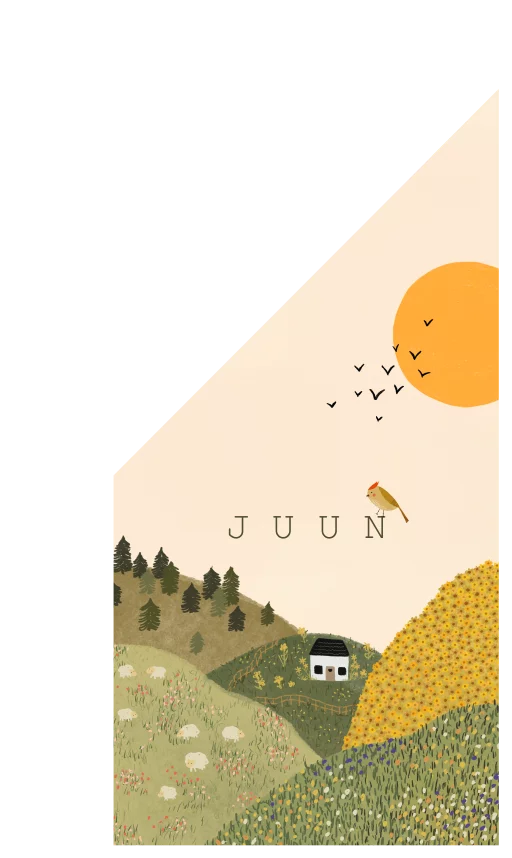 Geboortevlag met een heuvel landschap, een oranje zon, vogels, schaapjes, een huisje, bloemen en bomen.