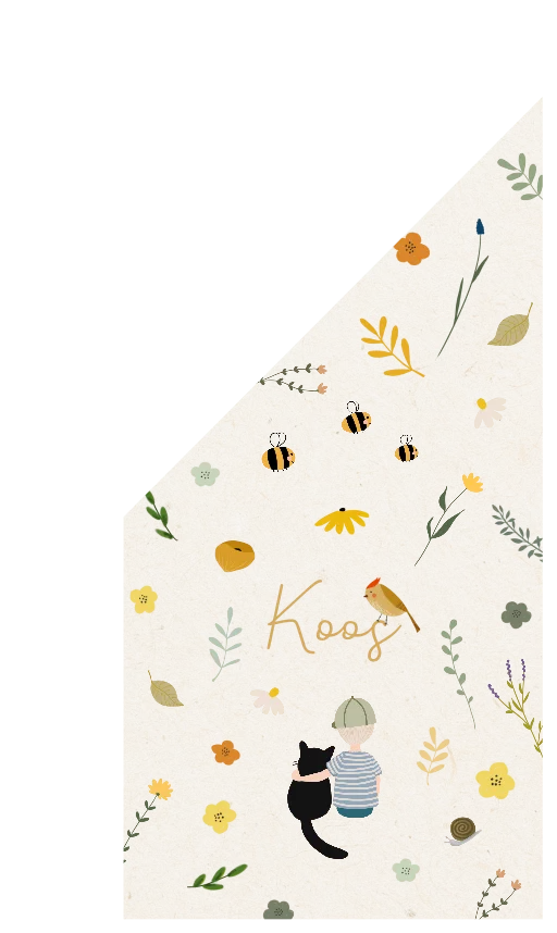Vrolijke lente geboortevlag met daarop een jongen met een kat, bloemen, bijtjes, een vogel, takjes en blaadjes.