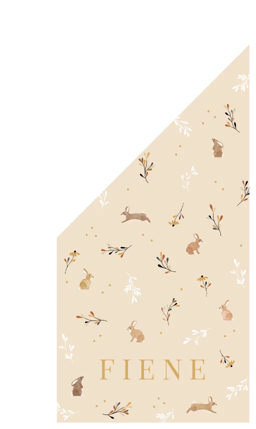 Geboortevlag met een zachtgele achtergrond, blaadjes in verschillende kleuren en konijntjes, hazen en stipjes.