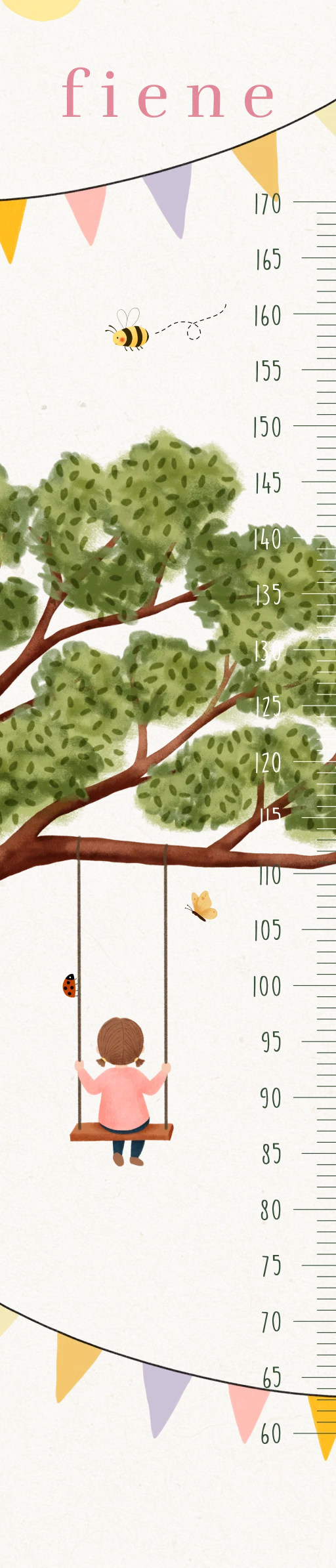 Groeimeter met slingers, diertjes en een meisje op een schommel