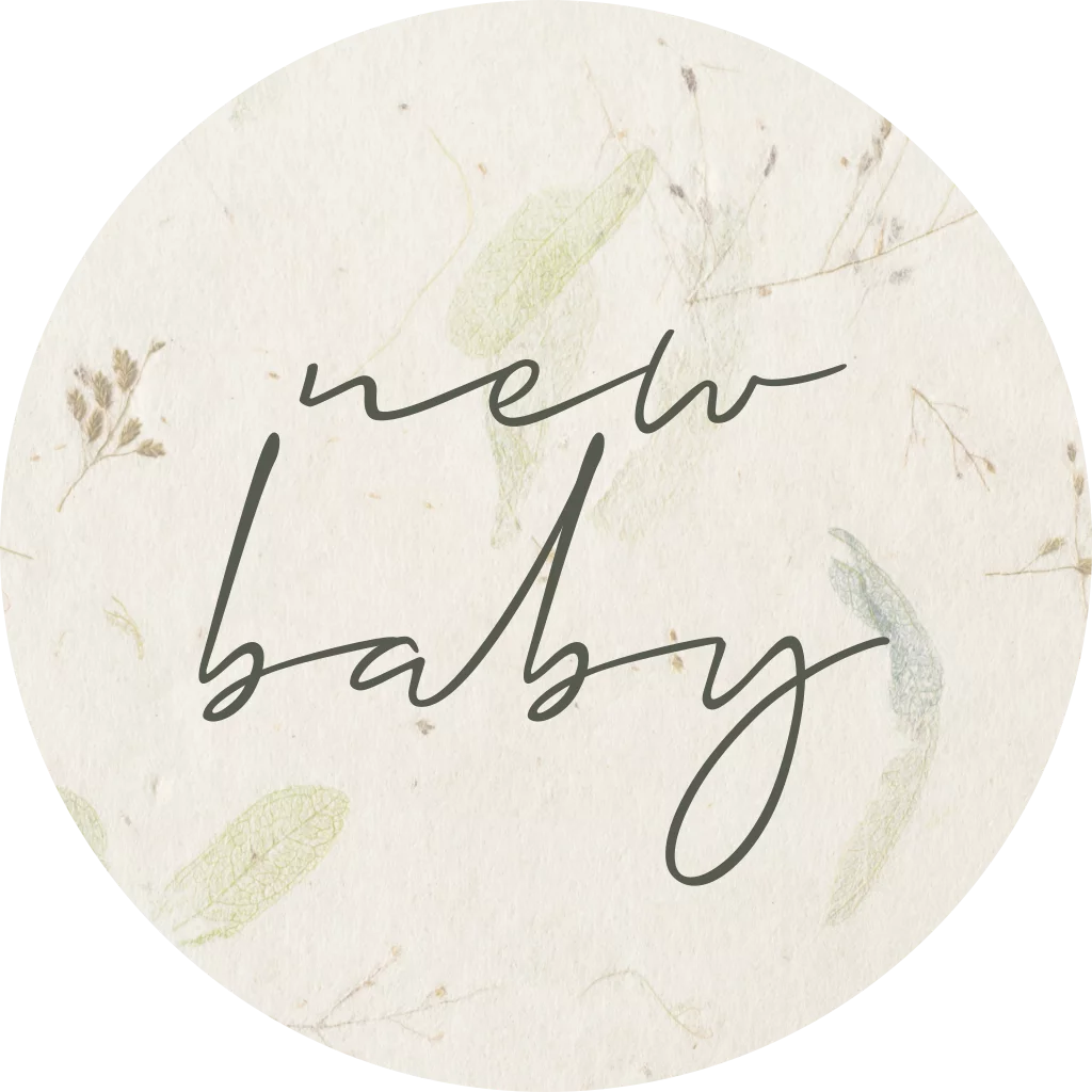 Sluitzegel met droogbloemen papier achtergrond en de tekst 'new baby'. Deze sluitzegel is perfect om te gebruiken voor het dichtplakken van de envelop met daarin het geboortekaartje. Het is een eenvoudig ontwerp met een klassieke typografie en een rustige groene achtergrond