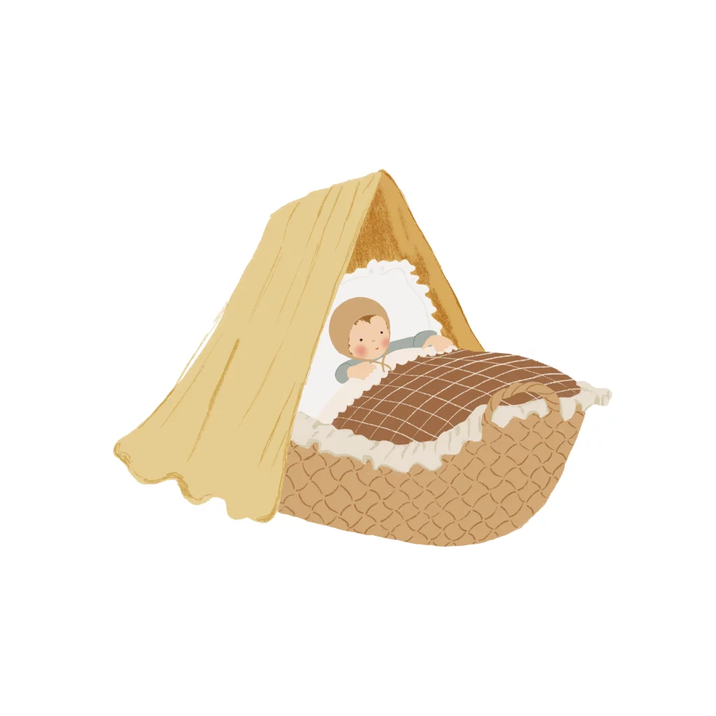 Sluitzegel met een rotan wiegje en geel hemeltje.