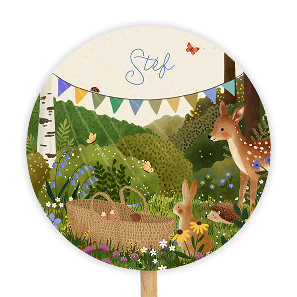 Rond tuinbord met een zonnig bos, een baby in een reismandje, een haasje, egeltje, lieveheersbeestje, vlinders en een hertje.