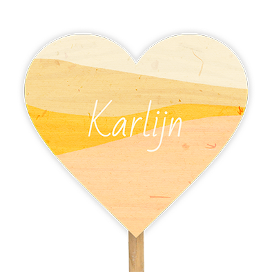 Tuinbord in de vom van een hart in gele kleuren en de naam van jullie kindje erop.