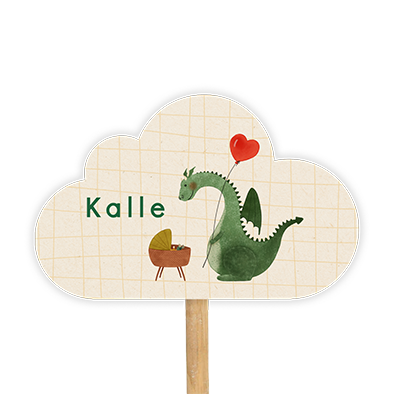 Tuinbord in wolkvorm met een wiegje en een grote viendelijke draak met een hartjesballon.