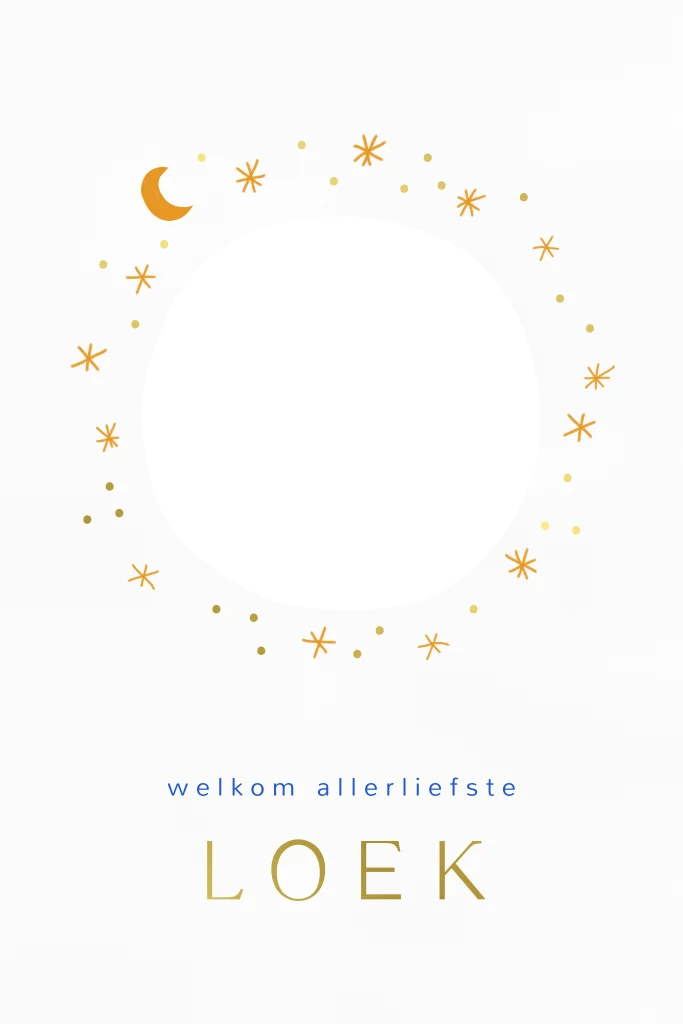 Winters geboortekaartje met een doorkijkje, een sleeënde ijsbeer, de maan, sterren en goudfolie.