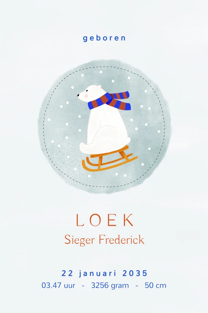 Geboortekaartje voor een winterbaby met een doorkijkje en ijsbeer