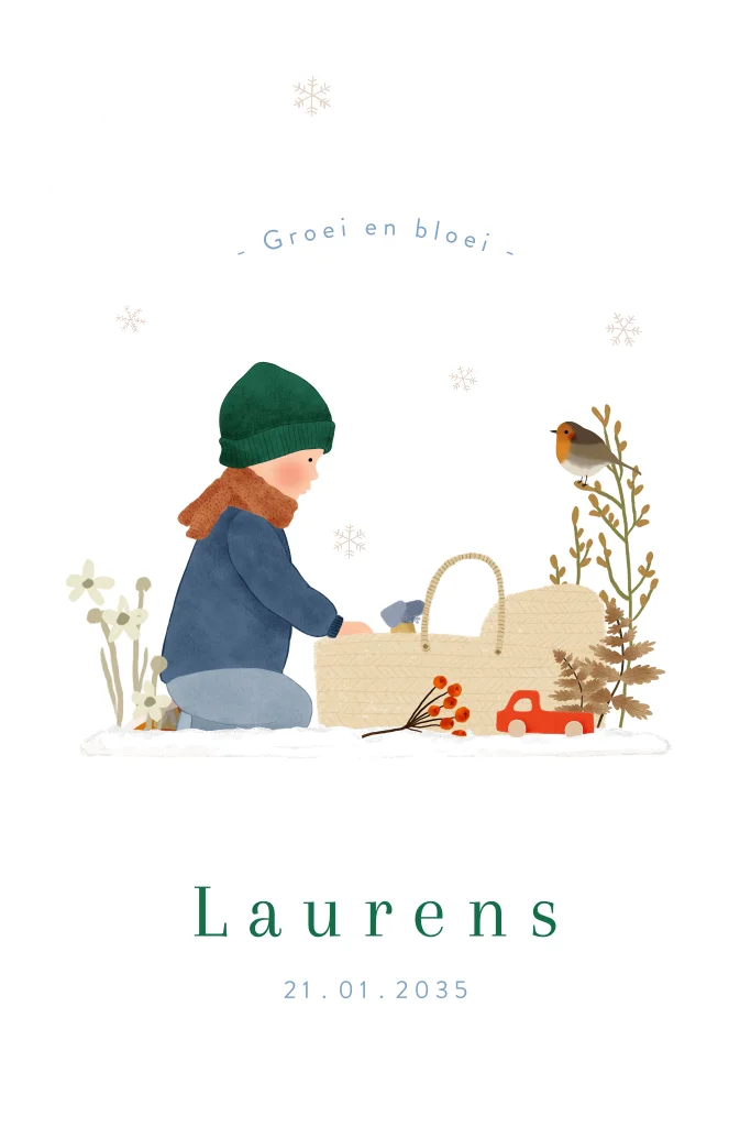 Is er een tweede kindje op komst en ben je op zoek naar een uniek en winters geboortekaartje? Dan is dit stanskaartje met een reiswiegje, een grote broer, sneeuw een speelgoedautootje en winterse bloemen echt iets voor jou!