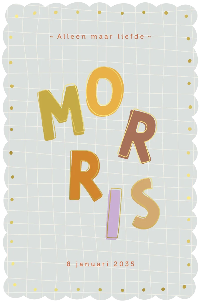 Folie geboortekaartje met een ribbelrand en letters in vrolijke kleuren