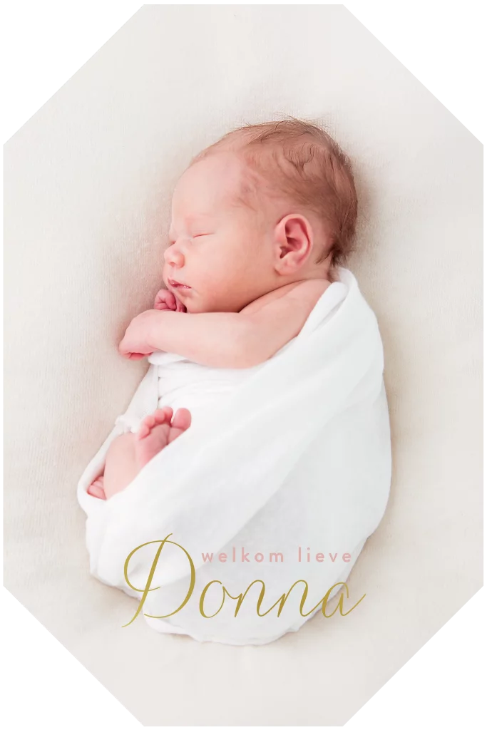 Staand foto geboortekaartje in een bijzondere vorm. De naam op de voorkant staat in goudfolie.
