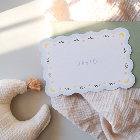 Liggend geboortekaartje met een golvende rand en illustraties van manen, sterren en takjes met blaadjes.