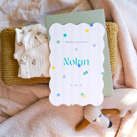 Ons hippe geboortekaartje in een golvende vorm met speelse confetti van blauwe, groene, gele en paarse kleuren, afgewerkt met een prachtige hoogglans, straalt originaliteit en vrolijkheid uit, precies wat jullie speciale moment verdient.
