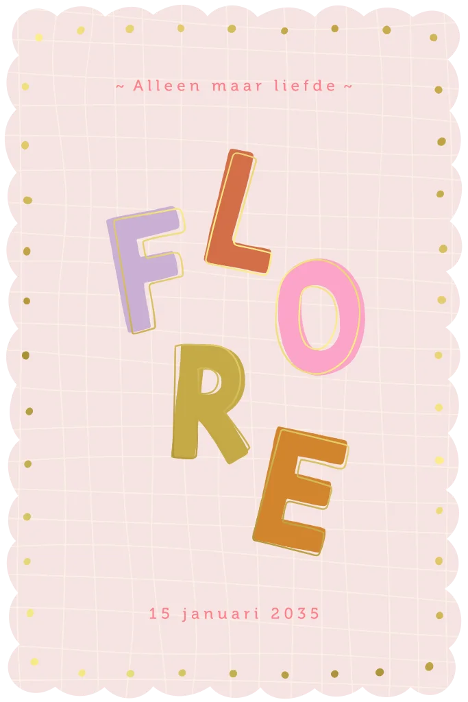 Geboortekaartje met letters in vrolijke kleuren, folie en een ribbelrand