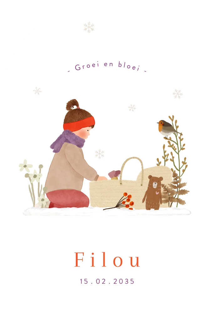 Is er een tweede kindje op komst en ben je op zoek naar een uniek en winters geboortekaartje? Dan is dit stanskaartje met een lief klein meisje in een reiswiegje, een grote zus, sneeuw een knuffelbeer en winterse bloemen echt iets voor jou!
