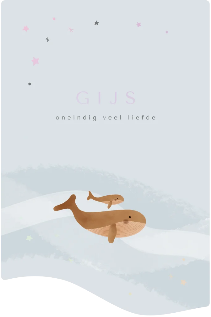 Gestanst geboortekaartje met walvissen, golven, sterren en holografische folie.