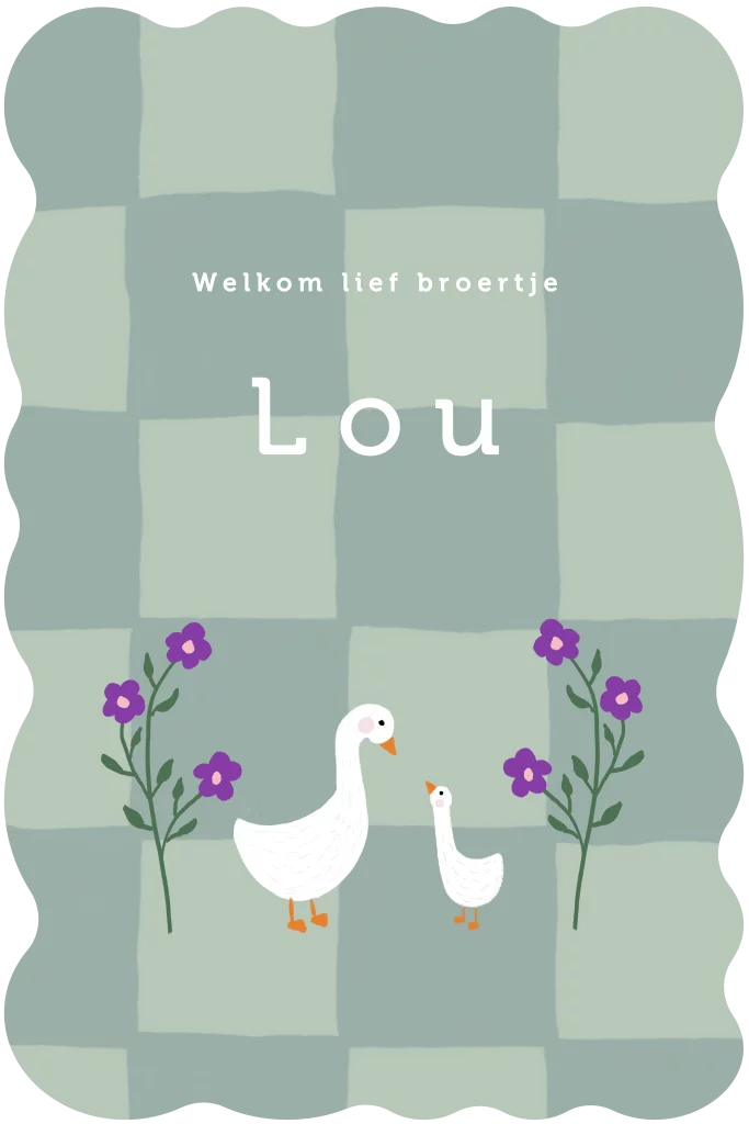 Op zoek naar een lief geboortekaartje voor jullie tweede kindje? Dit schattige kaartje met een ruitjes-achtergrond en ganzen is misschien wel precies wat je zoekt. De unieke vorm van dit kaartje zal zeker opvallen en een glimlach op het gezicht van de ontvangers toveren.