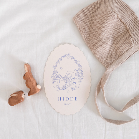 Op zoek naar een uniek en liefdevol geboortekaartje met een vleugje nostalgie? Ons ovaal geboortekaartje met een retro illustratie is precies wat je zoekt. De charmante illustratie toont een schattig kindje in een houten wiegje, omringd door speelse vogeltjes en een sierlijke rozenkrans. Dit kaartje ademt een klassieke en kleurrijke sfeer, perfect voor de lente en alle liefdevolle momenten die daarbij horen.