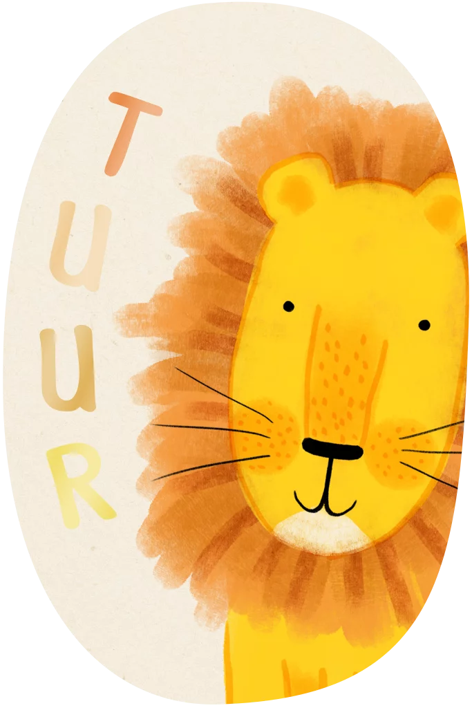 Ovaal kaartje met een vriendelijke leeuw en hoogglans