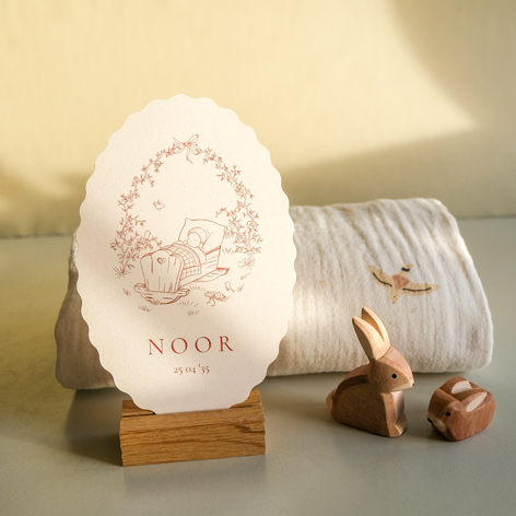 Dit prachtige ovale geboortekaartje met retro illustratie is een perfecte manier om de komst van jullie kleintje aan te kondigen. Het kaartje toont een schattige nostalgische illustratie van een kindje in een houten wiegje, omringd door vrolijke vogeltjes en een sierlijke rozenkrans.