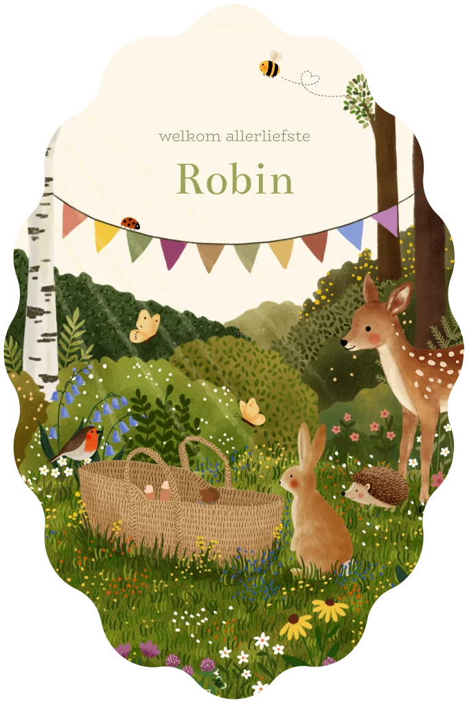 Geboortekaartje in een gekartelde ovalen vorm met berkenbomen en loofbomen, struiken, gras en bloemen. In het gras staat een rotan wiegje met een baby'tje. Een hertje, egel, haasje, roodborstje en vlinders komen naar het pasgeboren kindje kijken. Omdat het feest is hangen er slingers.