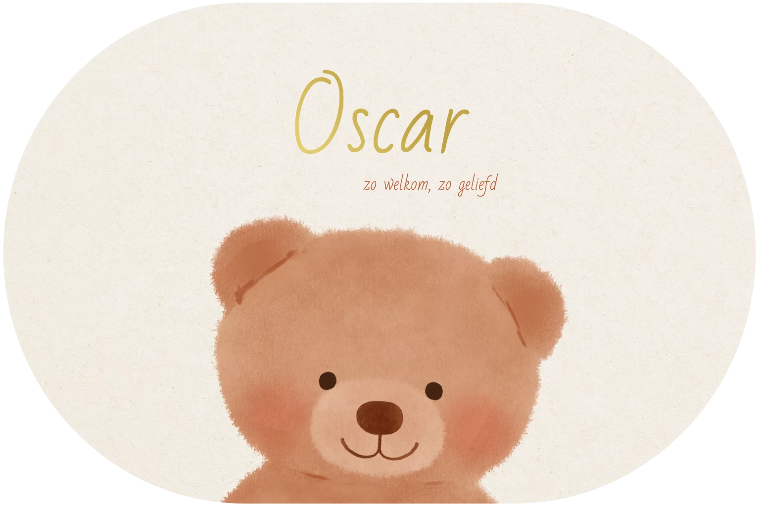 Liggend ovalen geboortekaartje met een illustratie van een lieve teddybeer en de naam in goudfolie.