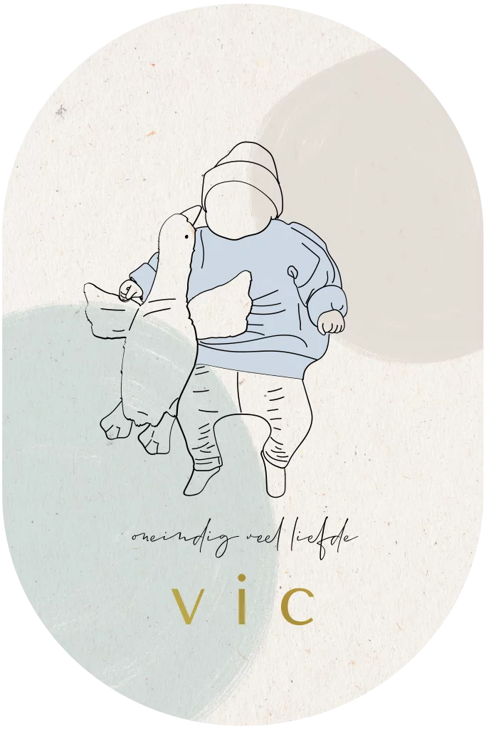 Stans geboortekaartje in de vorm van een ovaal met goudfolie gekleurde ronde vormen en een lijntekening van een jongen met een knuffel.