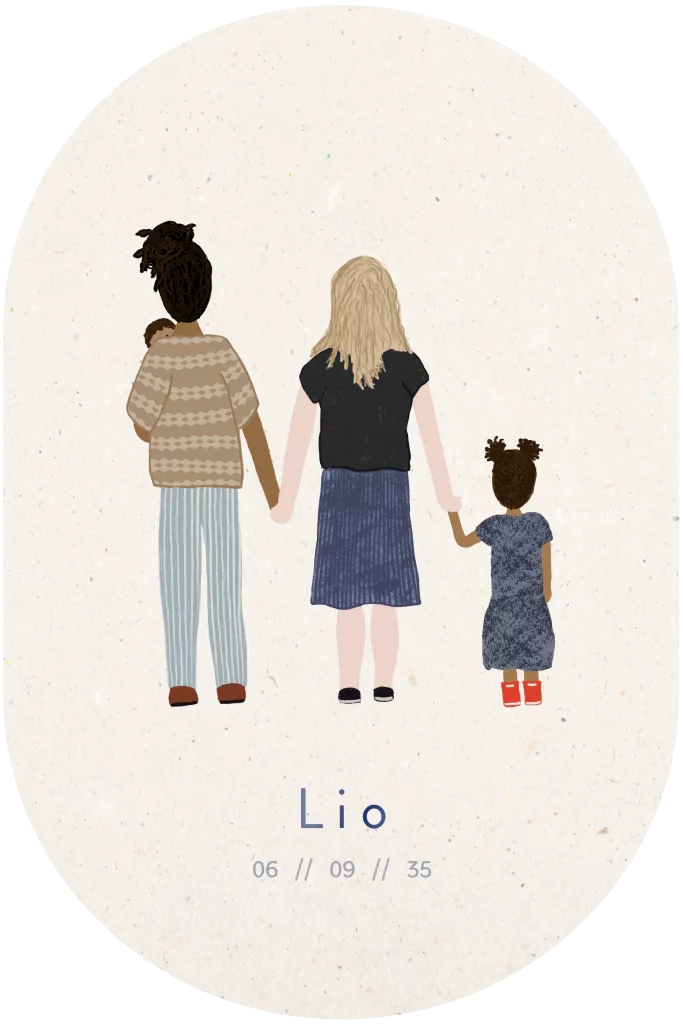 Ovaal geboortekaartje voor een klein kindje met twee mama's en een grote zus. De naam op de voorkant en de namen op de achterkant staan in hoogglans