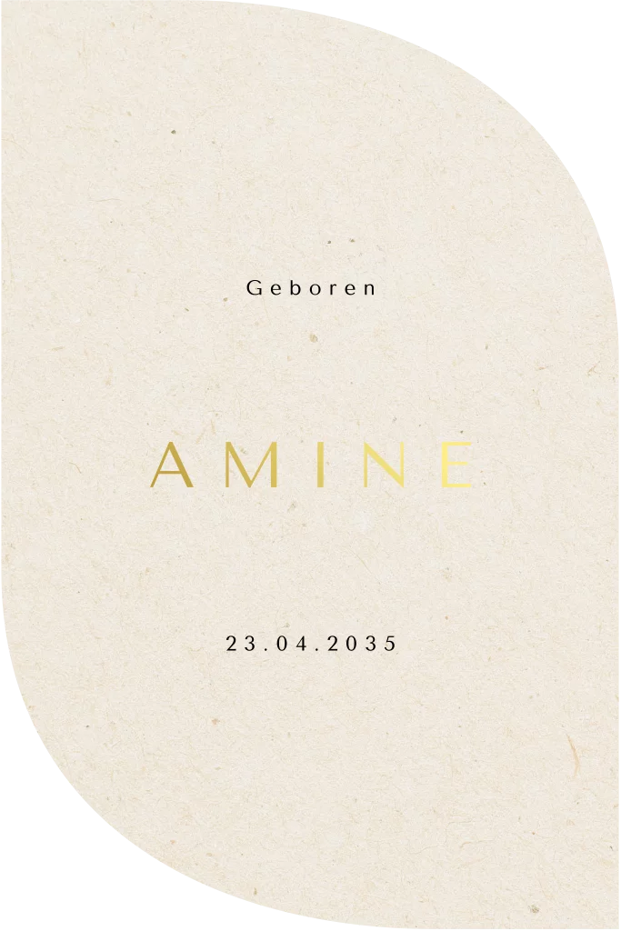 Neutraal gestanst geboortekaartje in een unieke vorm met goudfolie.