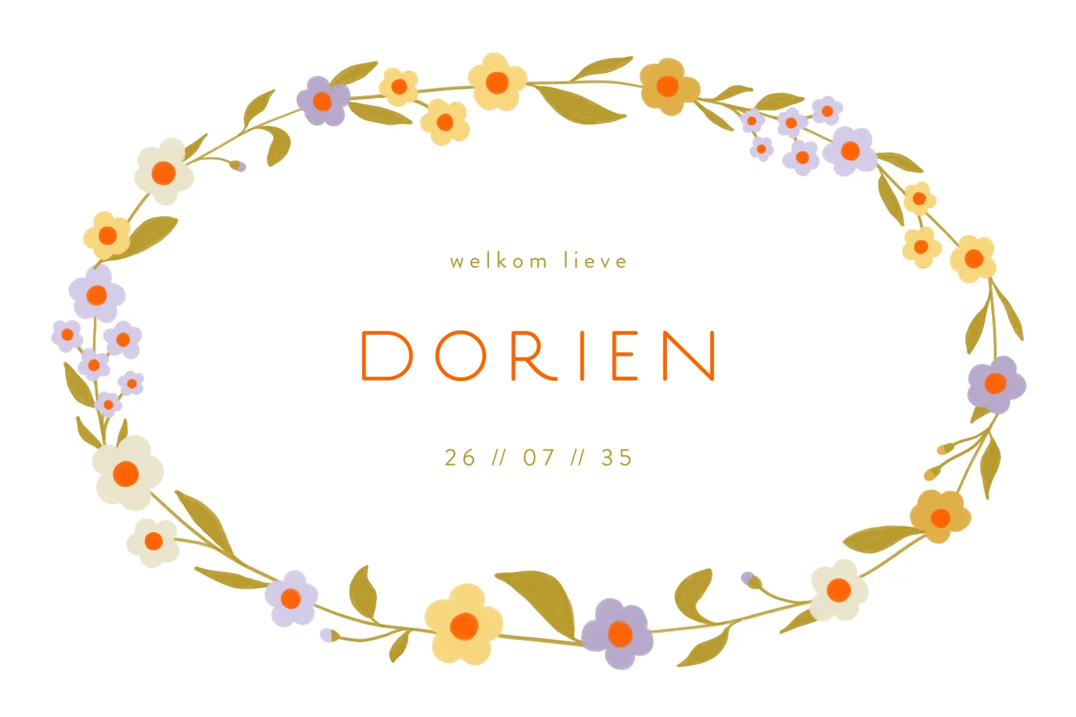 Vrolijk liggend gestanst geboortekaartje met een bloemenkrans.
