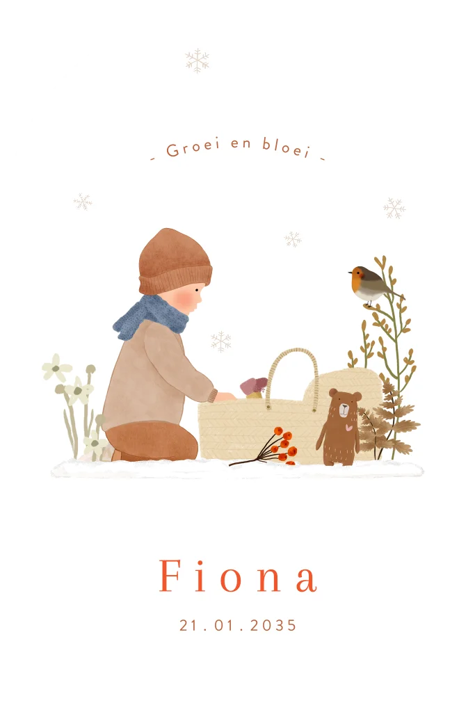 Is er een tweede kindje op komst en ben je op zoek naar een uniek en winters geboortekaartje? Dan is dit stanskaartje met een lief klein meisje in een reiswiegje, een grote broer, sneeuw een knuffelbeer en winterse bloemen echt iets voor jou!